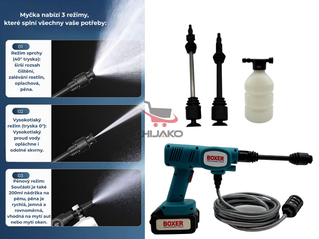 - Trysky: 3 různé trysky (vysokotlaká červená, vějířová bílá, pěnová láhev)